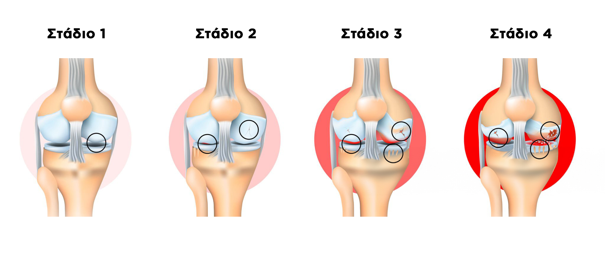 Τα τέσσερα στάδια της εκφυλιστικής οστεοαρθρίτιδας στην άρθρωση του γόνατος.